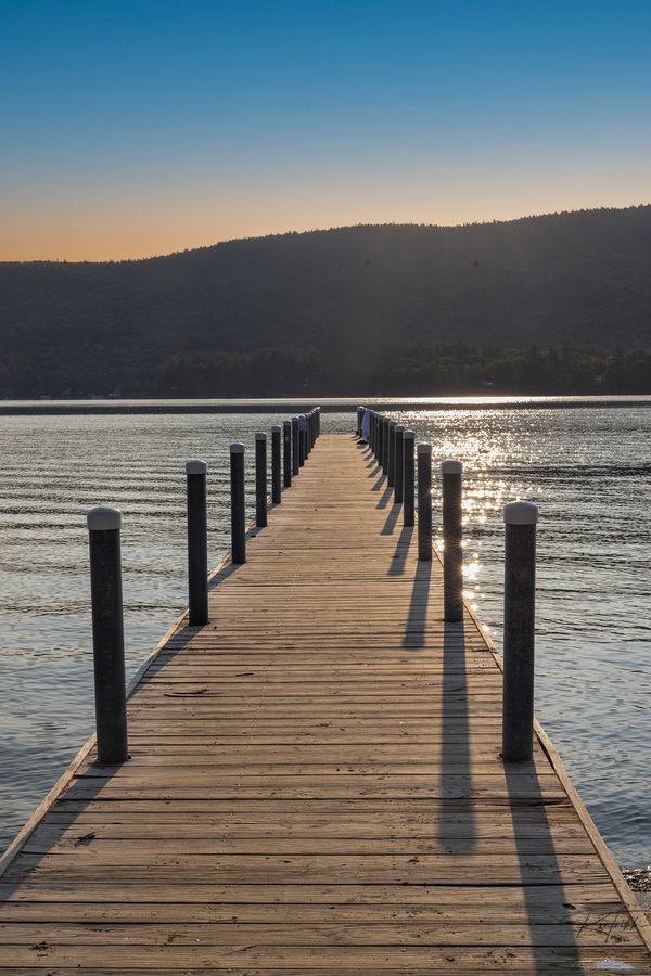 Early Morning showing dock on lake from Lake George New York.